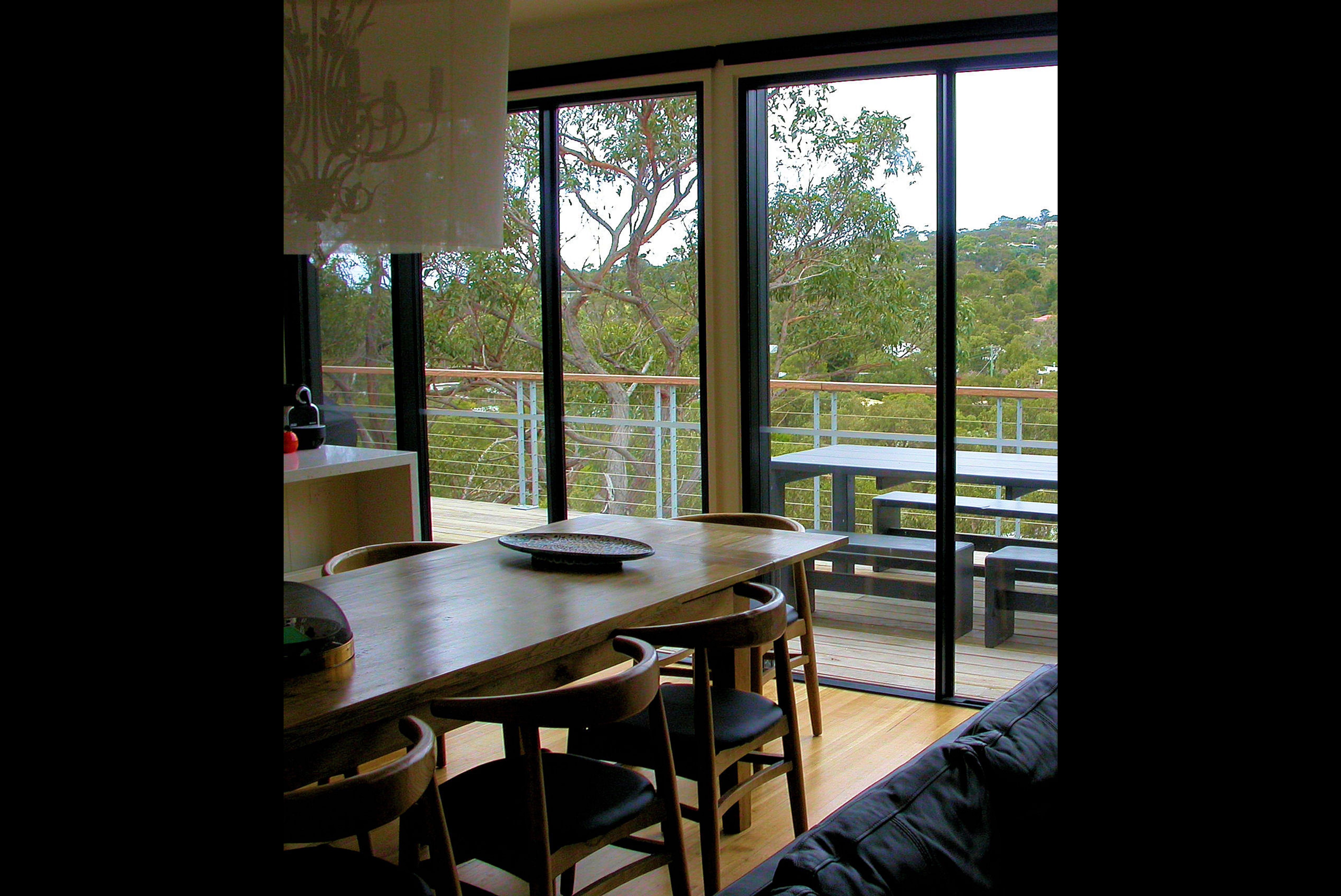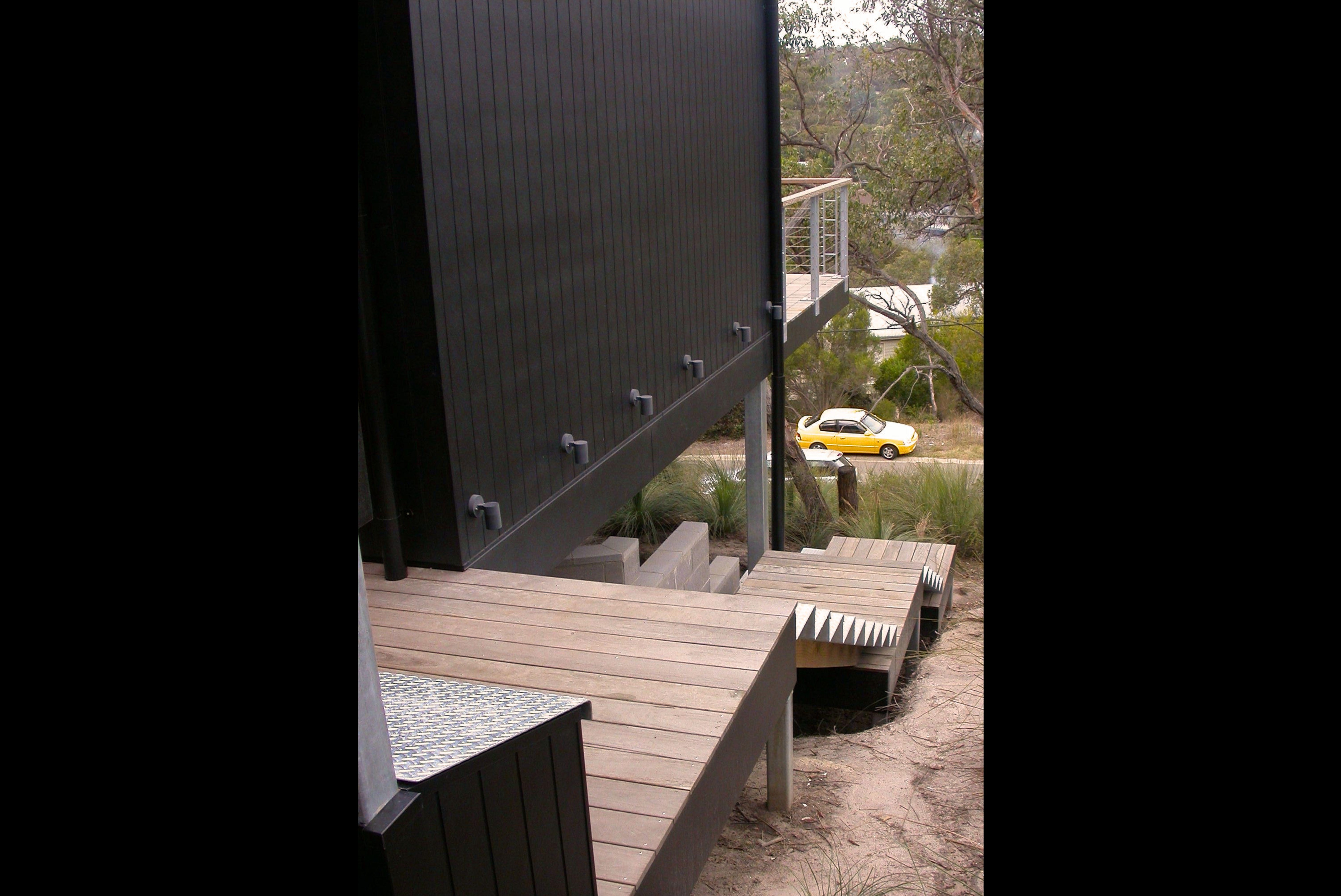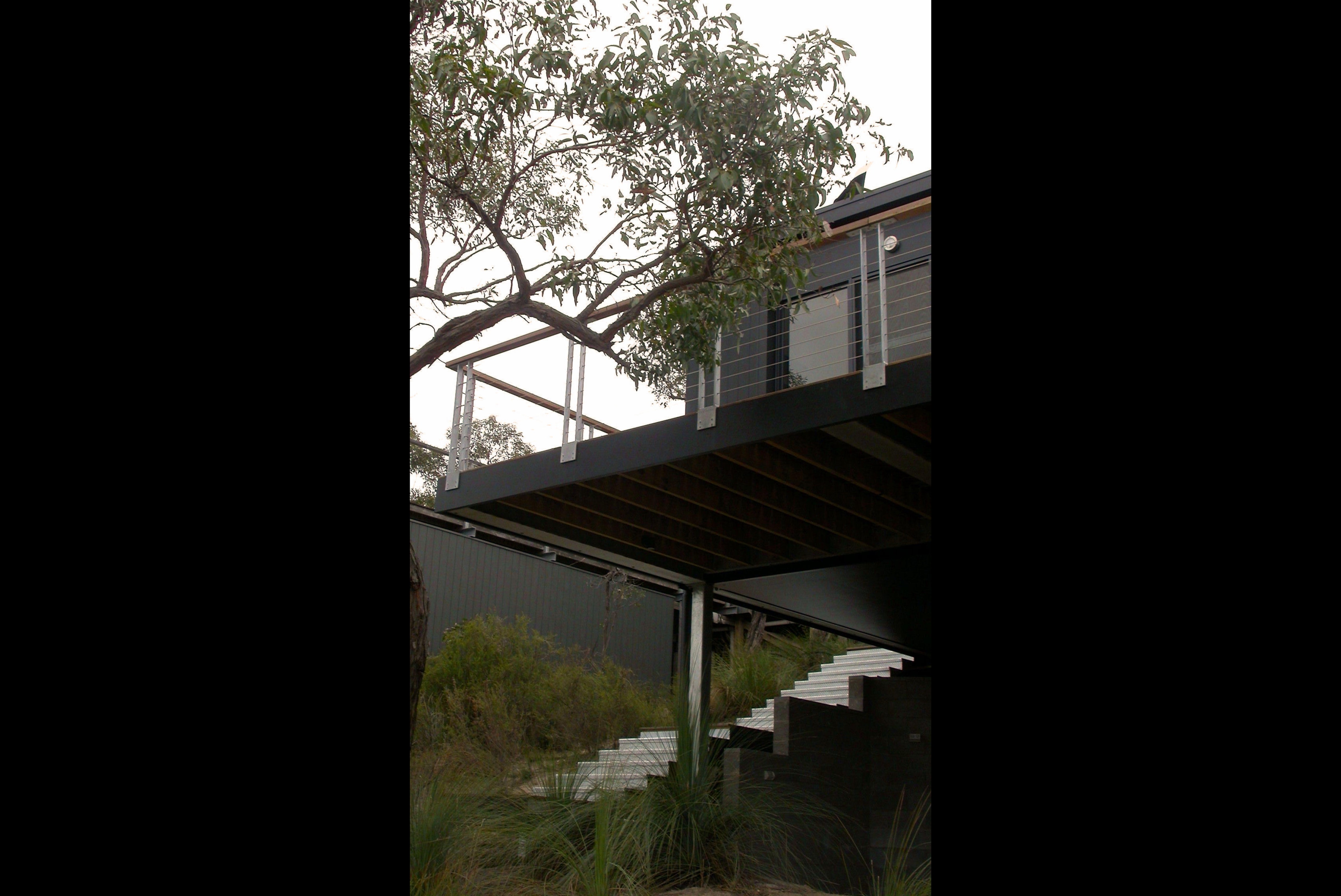 A 3 BR holiday house on a steep bush block in Anglesea. Upon climbing the ‘floating’ stairs, the front door opens into the Entry Area, & looking into the Internal Courtyard. Turn Right for the Living Room, Dining, Kitchen & Pantry, Powder Room, Main Bedroom & Ensuite, all with full height windows to the Internal Courtyard one side and a generous Balcony, with a view into the tree tops, on the other. The Study on this Floor Level looks into the Courtyard. Turn Left and stairs, with a Laundry half way up, lead to the 2 other Bedrooms.