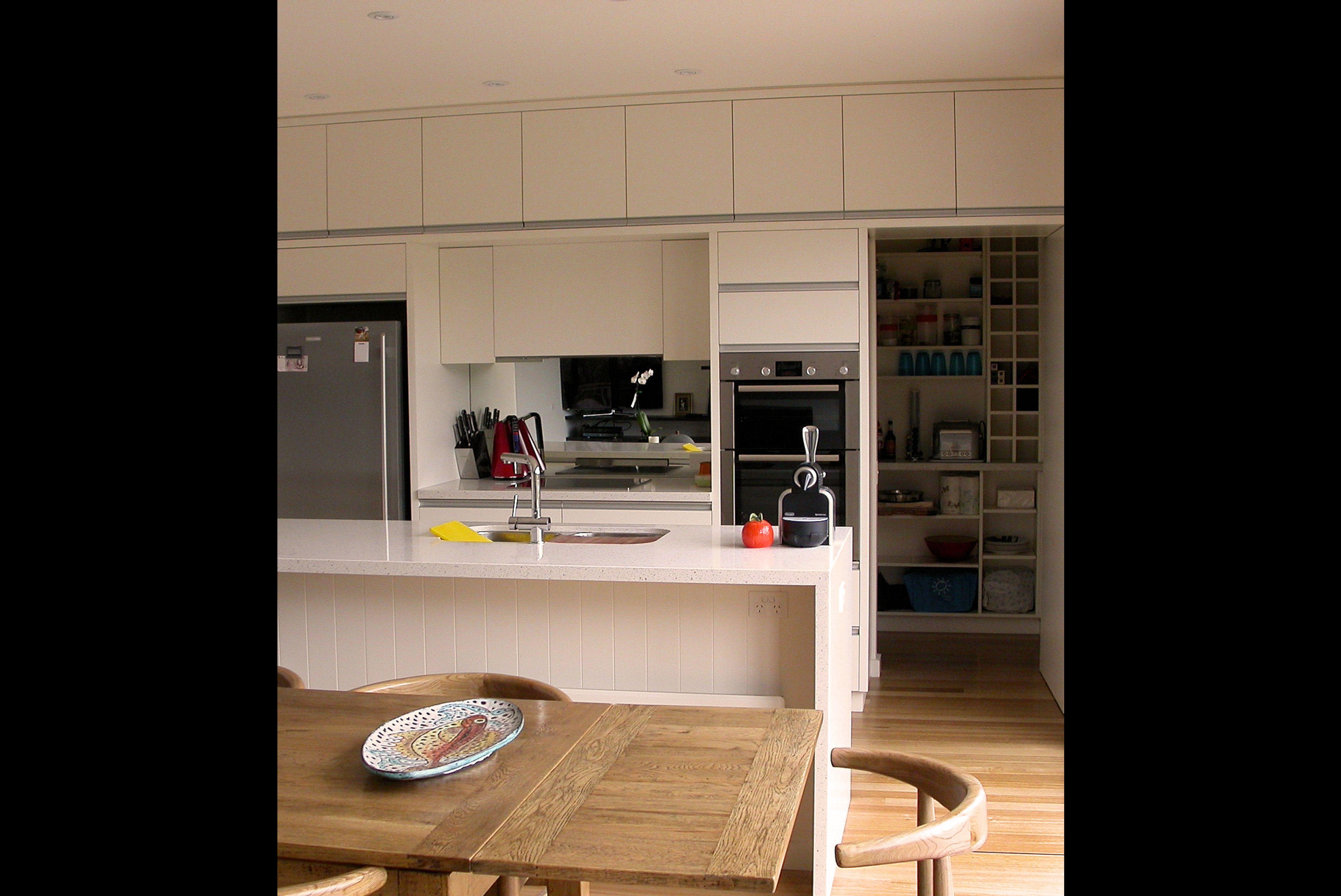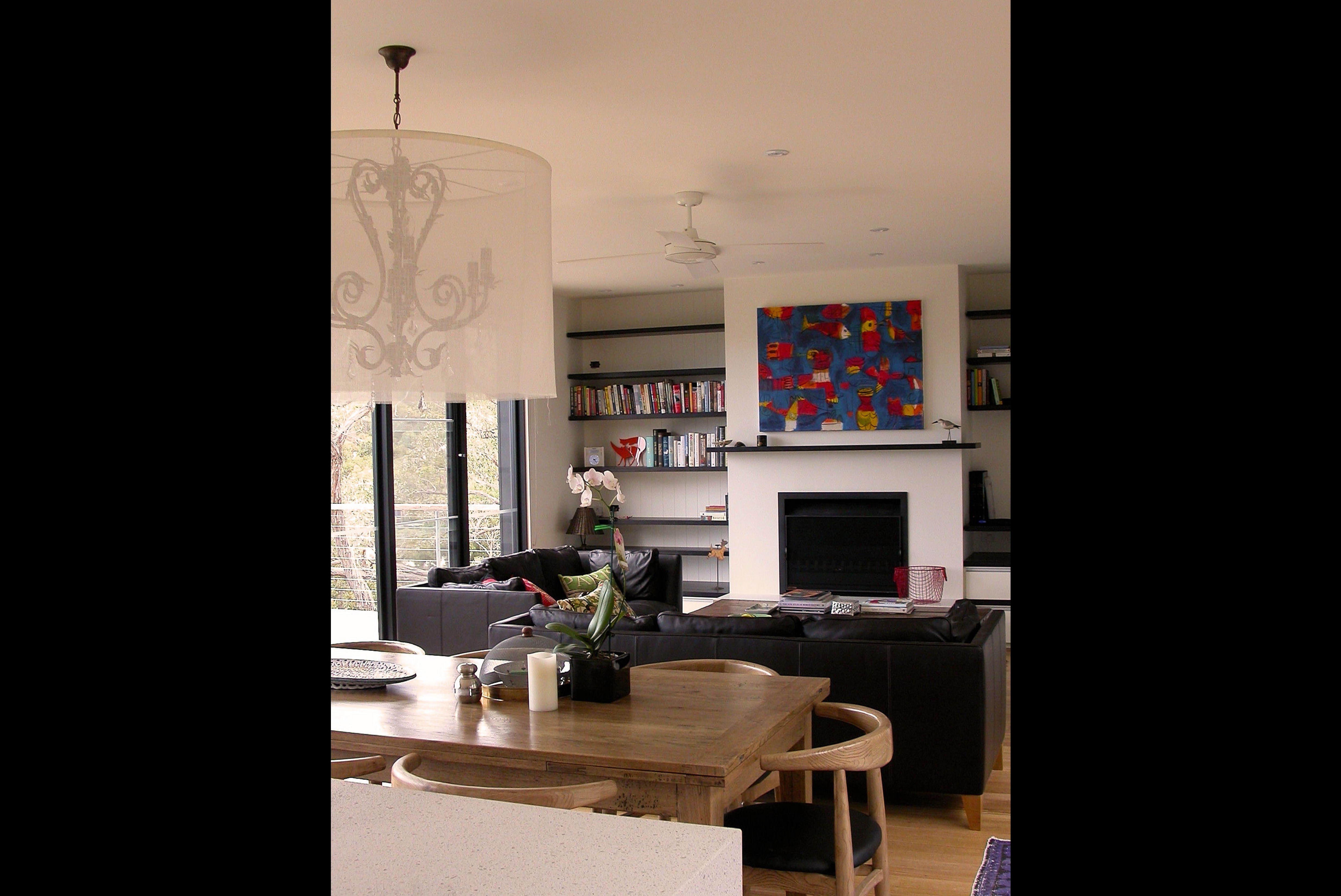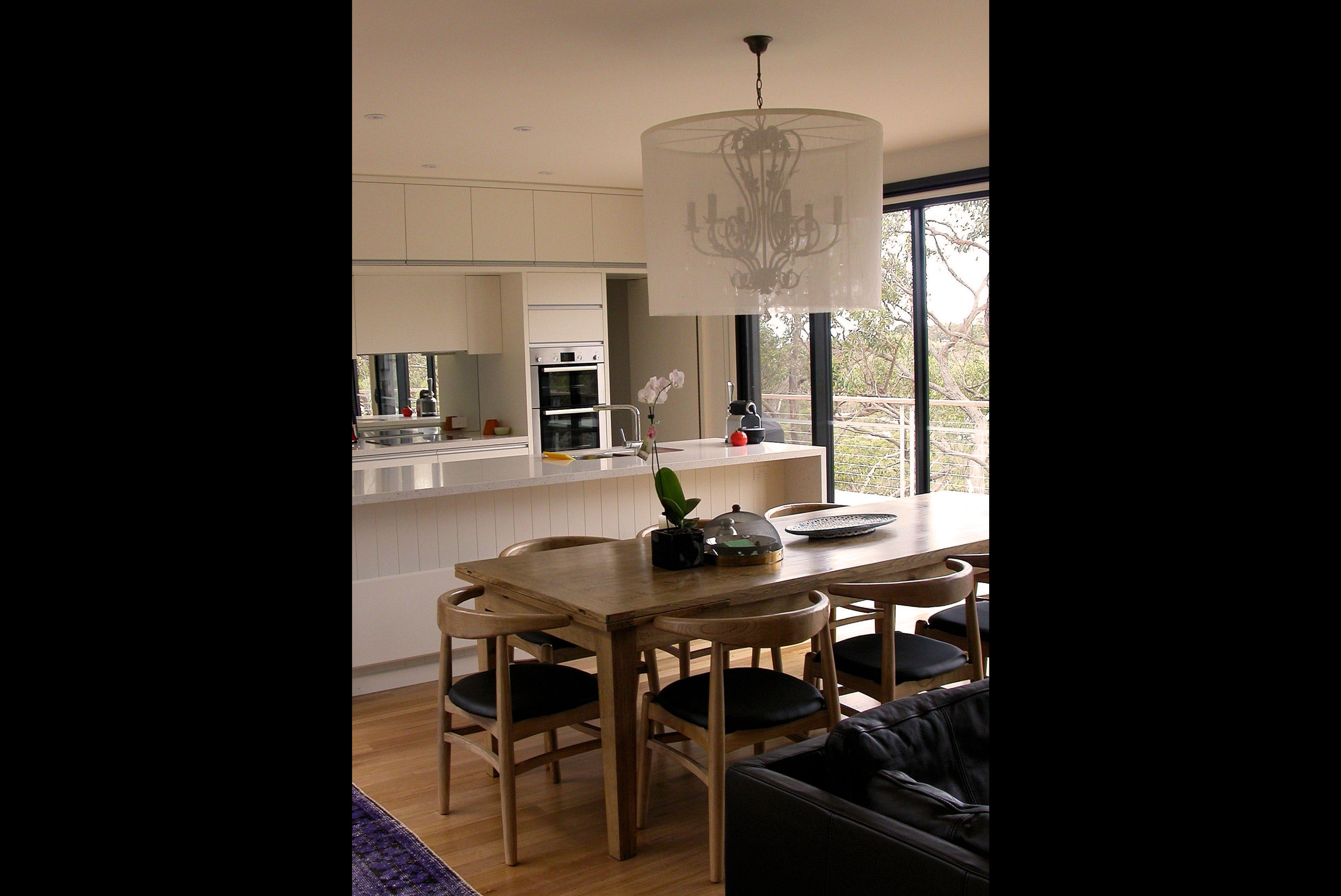 A 3 BR holiday house on a steep bush block in Anglesea. Upon climbing the ‘floating’ stairs, the front door opens into the Entry Area, & looking into the Internal Courtyard. Turn Right for the Living Room, Dining, Kitchen & Pantry, Powder Room, Main Bedroom & Ensuite, all with full height windows to the Internal Courtyard one side and a generous Balcony, with a view into the tree tops, on the other. The Study on this Floor Level looks into the Courtyard. Turn Left and stairs, with a Laundry half way up, lead to the 2 other Bedrooms.