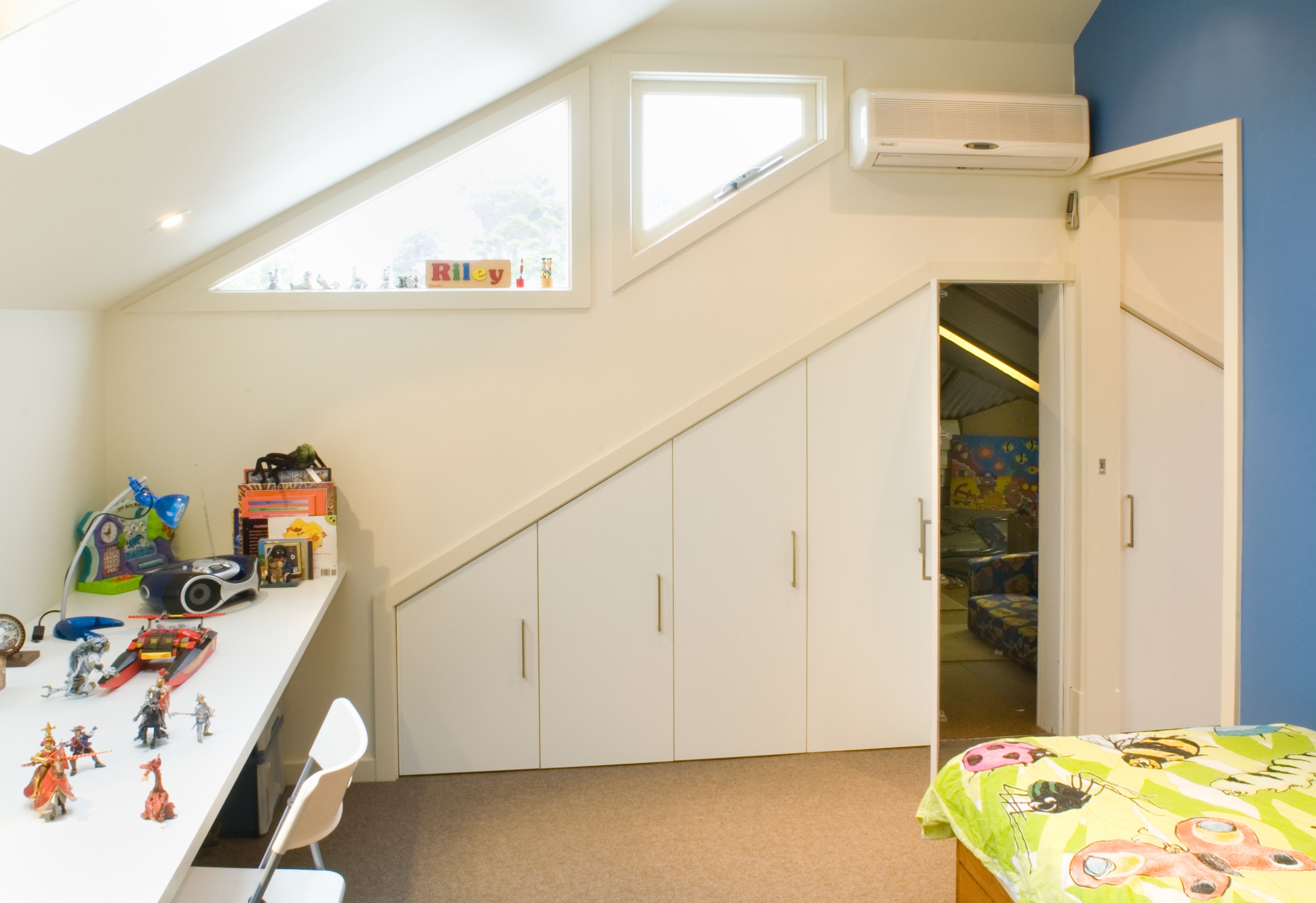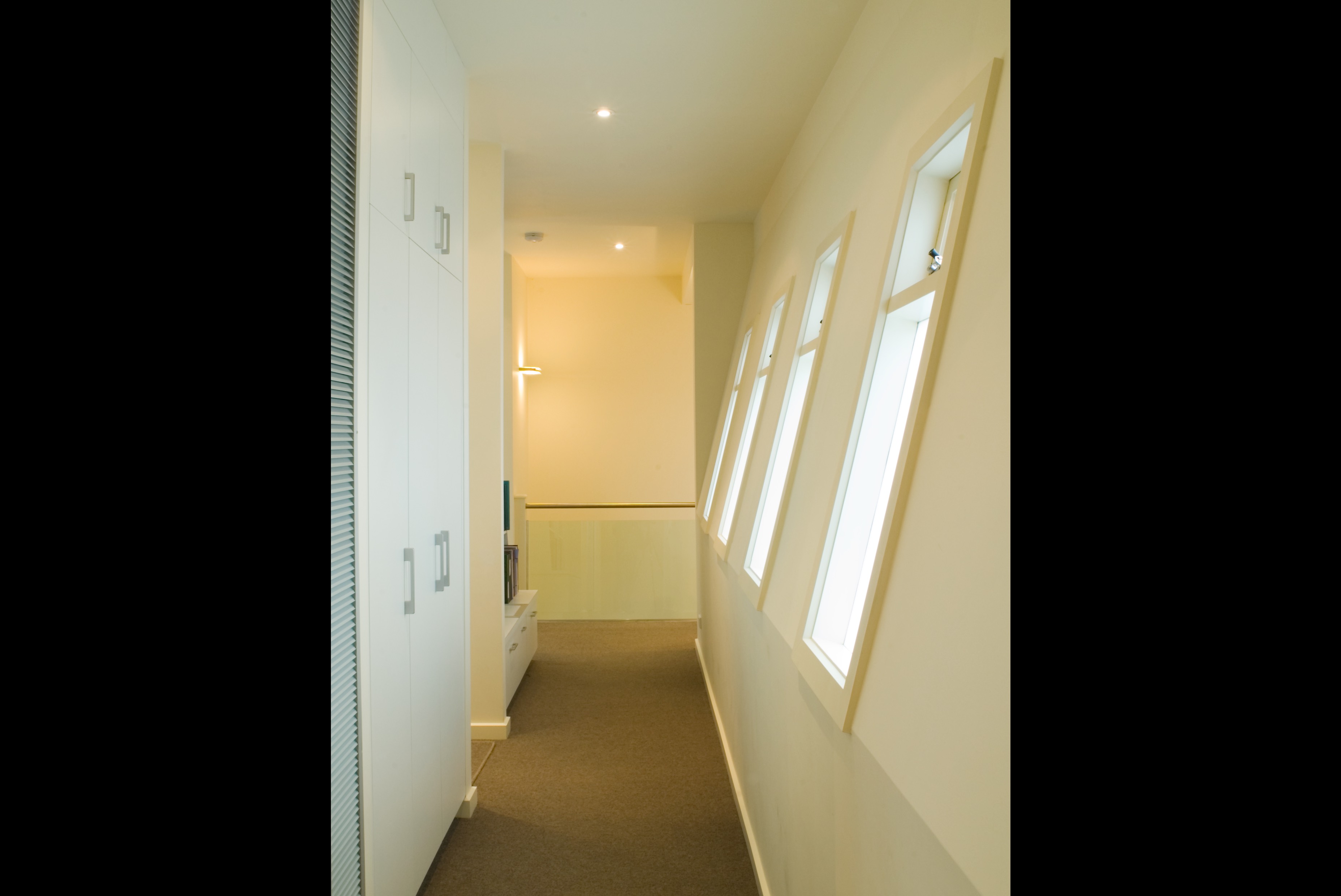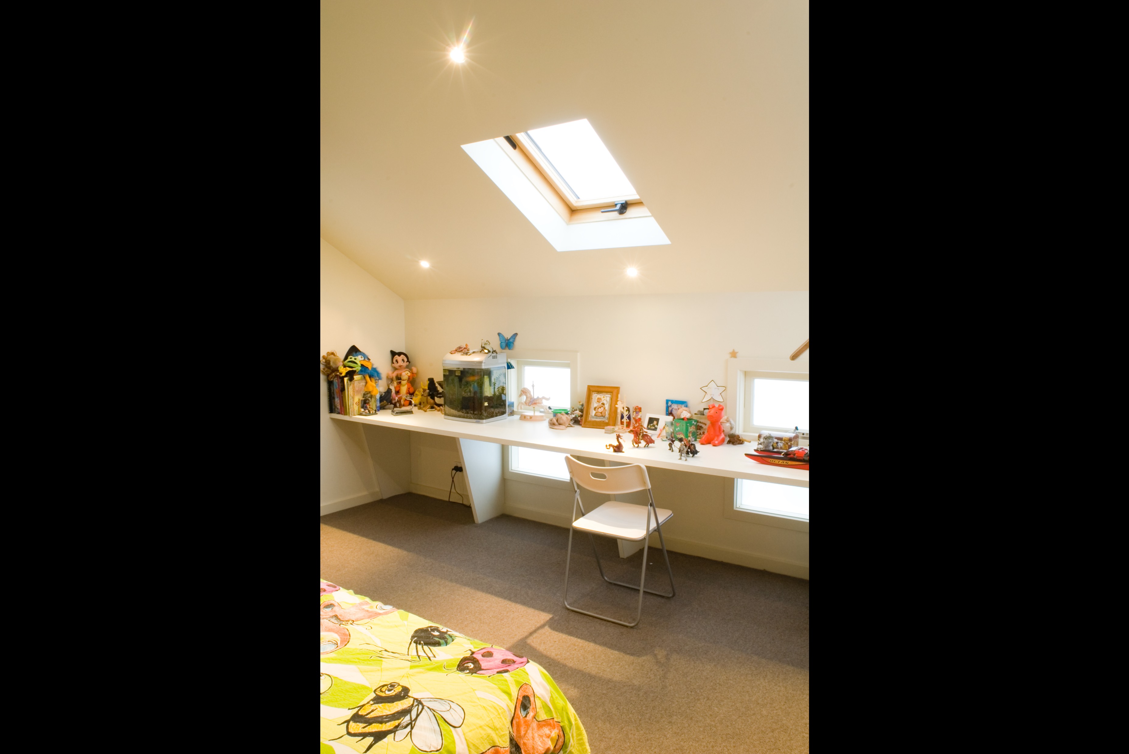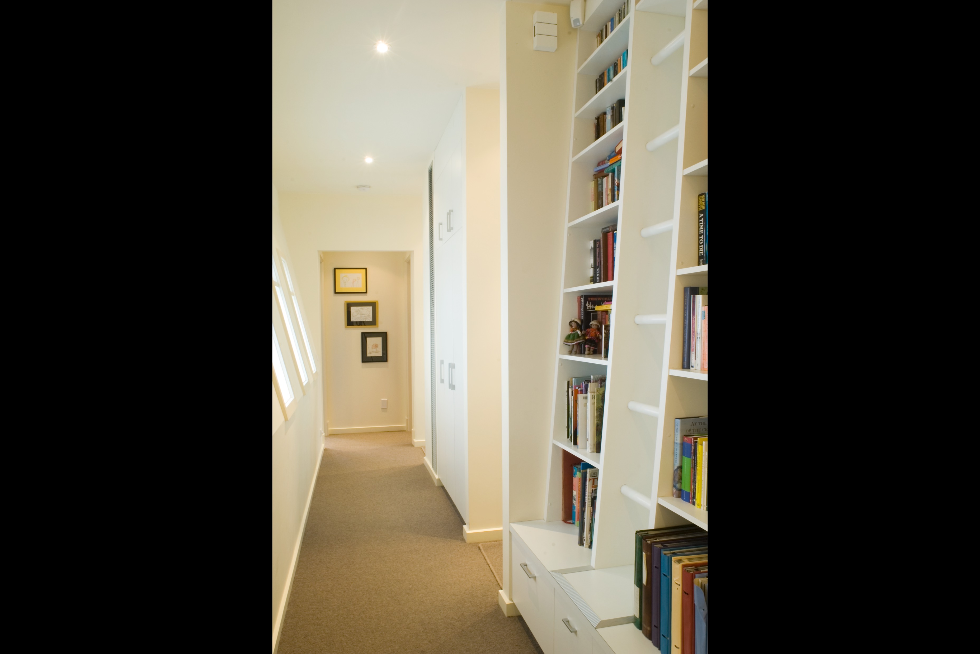 Another level was required to provide rooms for a growing family. Predominantly the addition was to provide a new Main Bedroom & Childrens Bedrooms & a Bathroom, including space for Storage and Books. Due to height limits and the to the scale of the Existing House it was decided to make the rooms ‘in the new roof” area. Structural Support for the new First Floor was by ‘buttress’ steel columns on the outside of the Existing House. Ground Floor Existing Areas were refurbished.