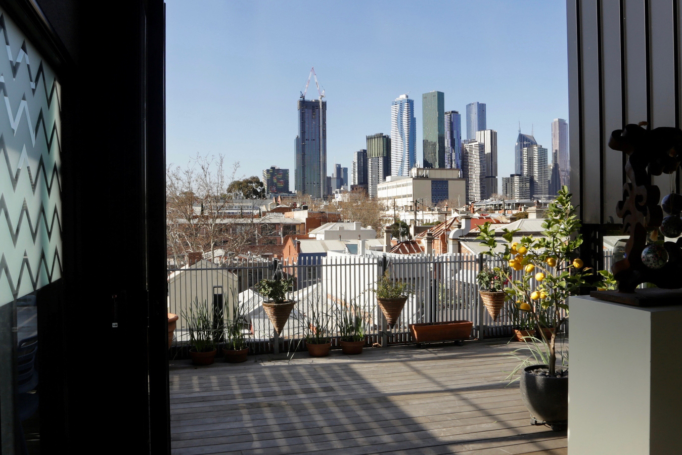 The Living, Kitchen & Pantry, Dining and Powder Room are located on the Second Floor with use of Decks to the East and West which take advantage of the 270 degree views to the city skyline and North Melbourne Town Hall.